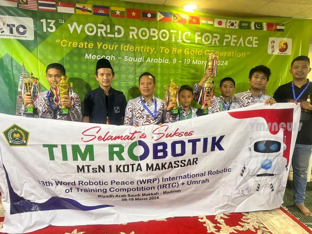SAUDI ARABIA – Orang Tua dan Keluarga besar civitas MTsN 1 kota Makassar patut berbangga, pasalnya tim robotiknya berhasil memboyong beberapa predikat juara pada Lomba 13th World Robotik of Peace yang diselenggarakan oleh Internasional Robotik Training and Competition (IRTC) di Hotel Khairot Miaz Al-Mahduda Al-Ittiha di Addhiafa, Mekkah Saudi Arabia, sejak tanggal 7-10 Maret Tahun 2024.