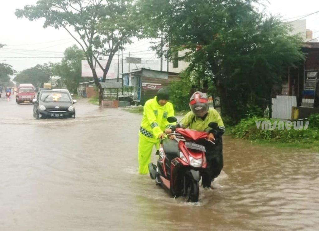 Akibat genangan air di ruas jalan tersebut, sejumlah sepeda motor warga yang melintas mogok. Polisi lalu lintas (Polantas) pun ikut membantu mendorong sepeda motor warga.