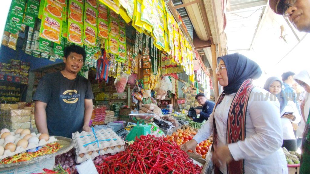 Kurang lebih 30 menit Sitti Sutinah Suhardi dan rombongan memantau harga pangan, mendapatkan sejumlah temuan.