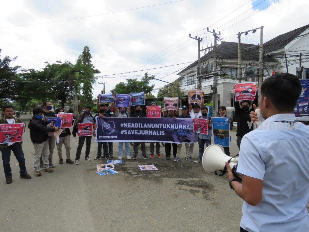Ketua Aliansi Jurnalis Independen (AJI) Kota Mandar, Rahmat. FA dalam orasinya mendesak Kapolri untuk mengusut tuntas pelaku serta keterlibatan otak pelaku kekerasan terhadap Nurhadi.