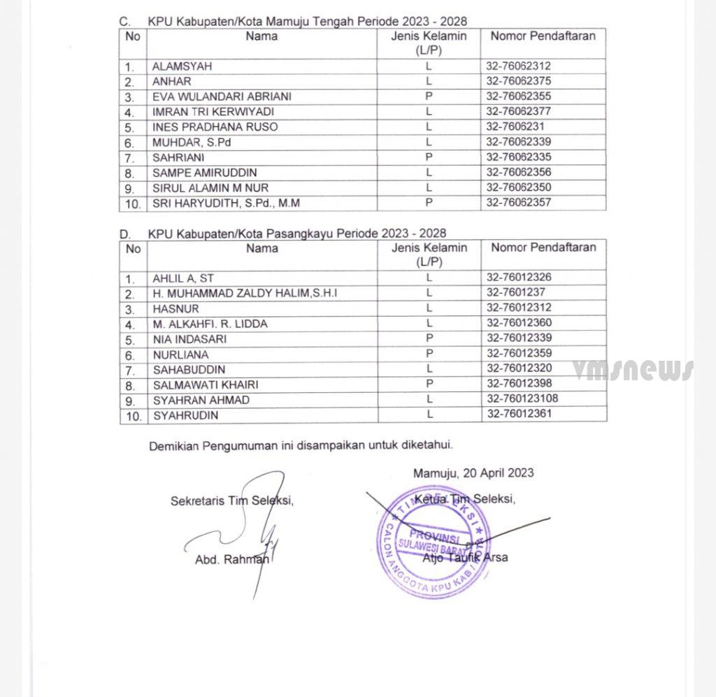 Penetapan itu tertuang dalam surat pengumuman bernomor 21/TIMSELKK.GEL.2-Pu/04/76-1/2023 tentang Hasil Seleksi Calon Anggota KPU/Kota Majene, Mamuju, Mamuju Tengah (Mateng), dan Pasangkayu Periode 2023-2028.