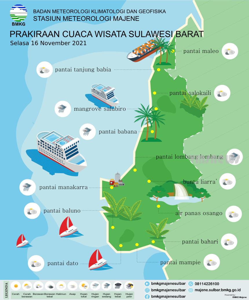 - Siang dan sore hari : Berawan dan berpotensi hujan ringa-sedang di wilayah Kab. Majene, Mamasa, Mamuju (Kecamatan Bonehau, Kalumpang dan Tapalang) dan Polewali Mandar.