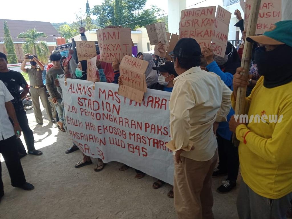 MAMUJU-Puluhan Warga yang bermukim di area Stadion Manakarra, Kelurahan Binanga, Kecamatan Mamuju, Kabupaten Mamuju, Sulawesi Barat, menggelar unjuk rasa di depan Kantor Bupati Mamuju, Kamis, (17/02/2022).